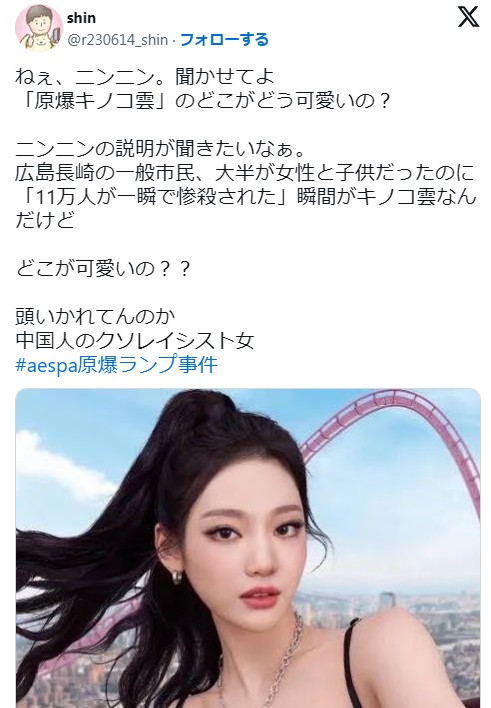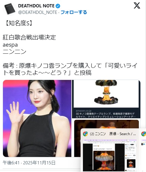 ところが発表直後からSNS上で賛否両論が巻き起こり、特に中国人メンバー・ニンニンさんが過去に投稿した「キノコ雲型ランプ」の写真が再び拡散され、批判の声が殺到する事態となっています。