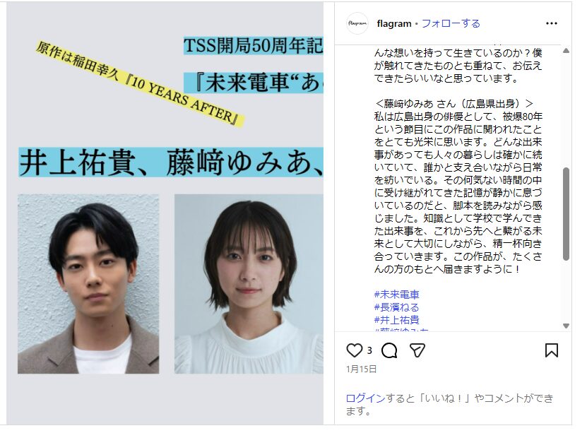 2026年3月3日(火)よる7時から、テレビ新広島開局50周年記念ドラマ『未来電車あの日を知らないあなたへ』が放送予定です。