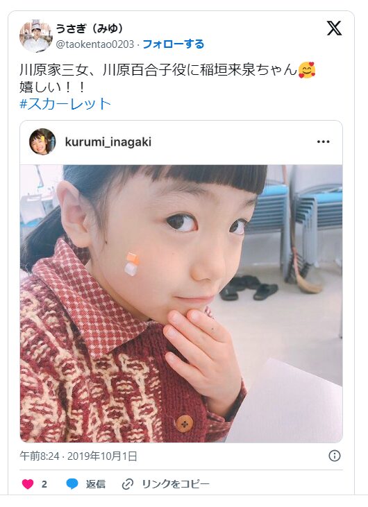 2019年度後期放送の『スカーレット』では、川原百合子(幼少期)を演じました。 (
