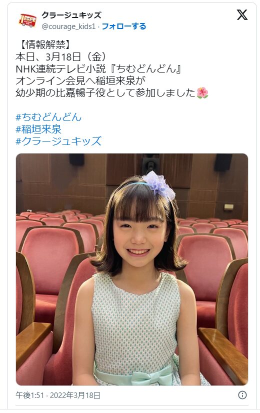 『ちむどんどん』での出演により、稲垣来泉さんは朝ドラ3作品でヒロインやその周辺の幼少期を演じたという実績を築きました。