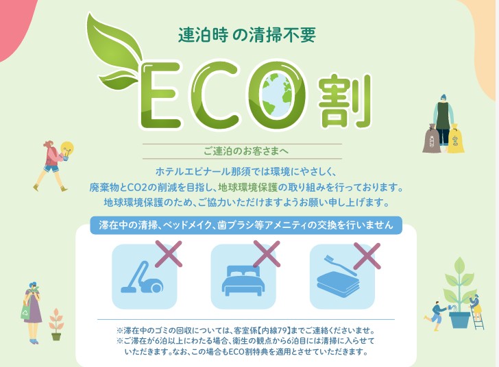 たとえば、ホテルエピナール那須は、連泊時の清掃不要(ECO割)への導線が明示されています。
