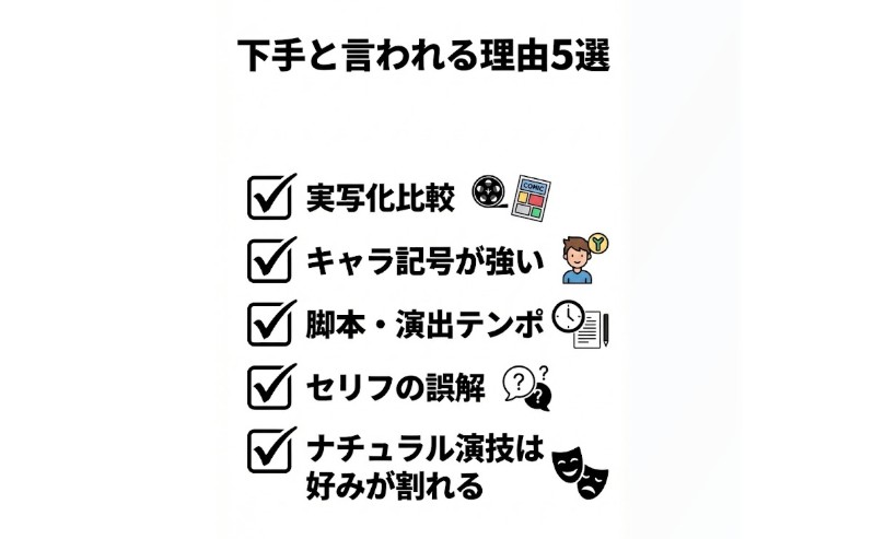 「下手」と断定されがちでも、実写化・キャラの記号性・脚本演出の印象が重なると、誰でも厳しく見られやすいです。