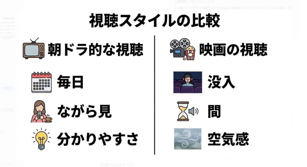 朝ドラの見方で映画を採点すると「地味」に見え、映画の見方で朝ドラを採点すると「大げさ」に見える、というズレが起きます。