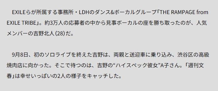 2024年10月1日、週刊文春が「RAMPAGE・吉野北人(28)が菜々緒似スタッフと7年愛【同棲スクープ撮】」という記事を発表。