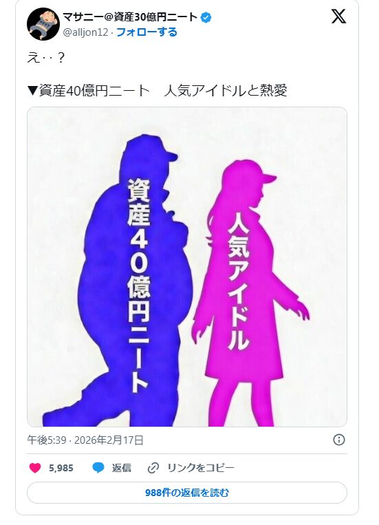 2026年2月17日、純金融資産40億円(総資産60億円)を自称するマサニー氏が、自身のX(旧Twitter)で週刊誌『週刊文春』でおなじみの男女シルエット画像を投稿しました。