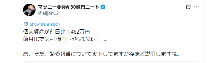 「Xでは、資産が大幅にマイナスになると悲嘆にくれるような投稿をしているが、これは暇つぶしに騒いでいるところがある。ネタとして成金キャラに成りきって投稿をするのが好きだ」